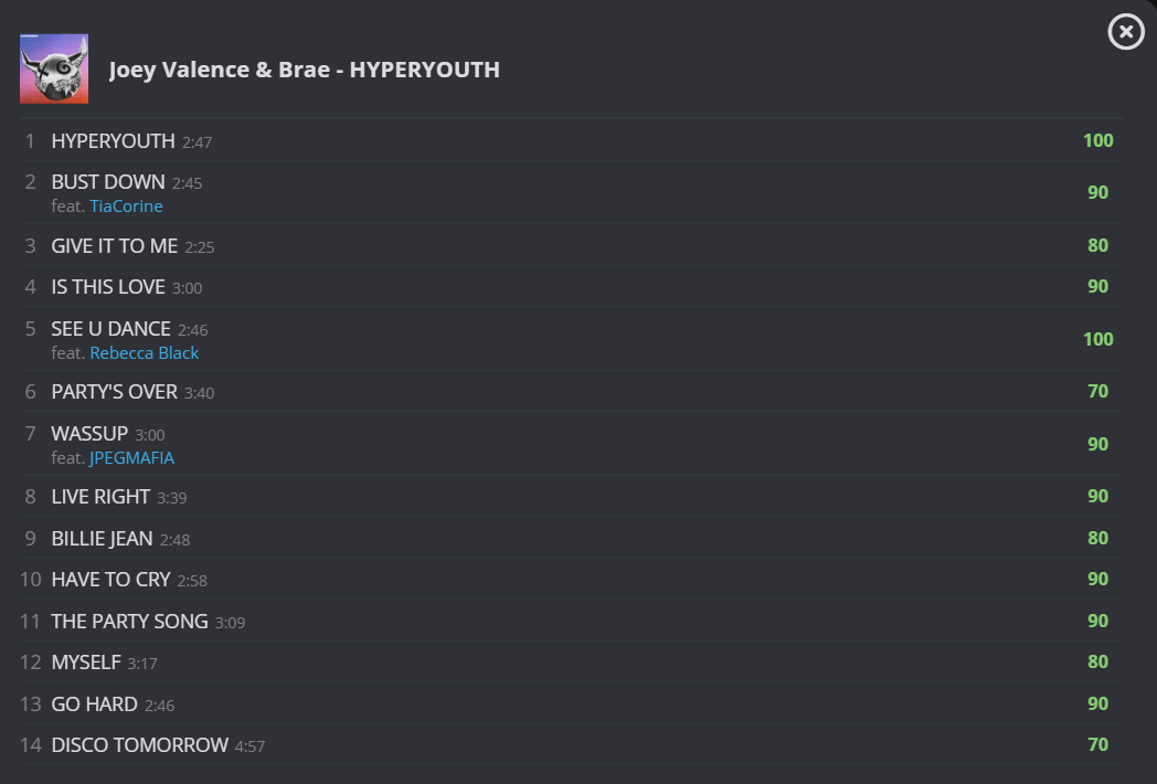 The project also has some very well-selected features. There are a bunch of artists just a step away from the pop mainstream slotting their way into here—JPEGMAFIA’s verse on “WASSUP” is great, but I think the Rebecca Black-led chorus on “SEE U DANCE” might actually be the single catchiest moment on the project.