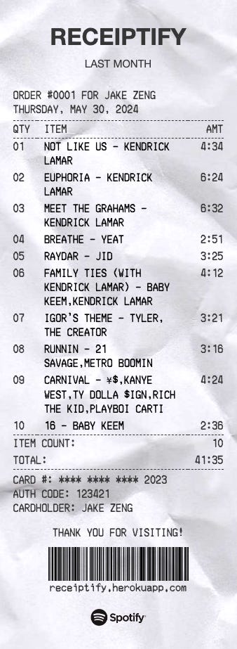 Call me a glazer if you want. My favorite artist is Kendrick Lamar, my favorite album is good kid, m.A.A.d. city, and my favorite song is Sing About Me, I’m Dying of Thirst (which I will discuss in GREAT DETAIL in my first post). Kendrick is winning the beef by a mile and Meet the Grahams is the best diss track of all time, although Family Matters by Drake is actually a really great song.